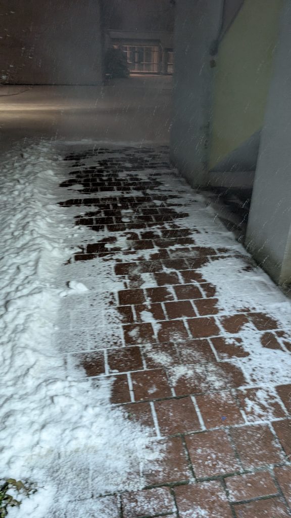Passend zur Stimmung hat es heute geschneit. Weißer Dreck, der morgen eh wieder weg ist – genau wie meine Hoffnung auf eine nachhaltige Lösung hier. Ich wusste nicht wofür, aber ich habe den Schnee mal weggemacht. Damit sich hier niemand der wertvollen Mitarbeiter oder Patienten auf die Nase legt. Seht ihr? Ich kann richtig nett sein, wenn ich will. Oder wenn ich einfach nur irgendetwas tun muss, um nicht durchzudrehen. Schauen wir mal, wie es wird. Wahrscheinlich genauso matschig wie der Schnee morgen.